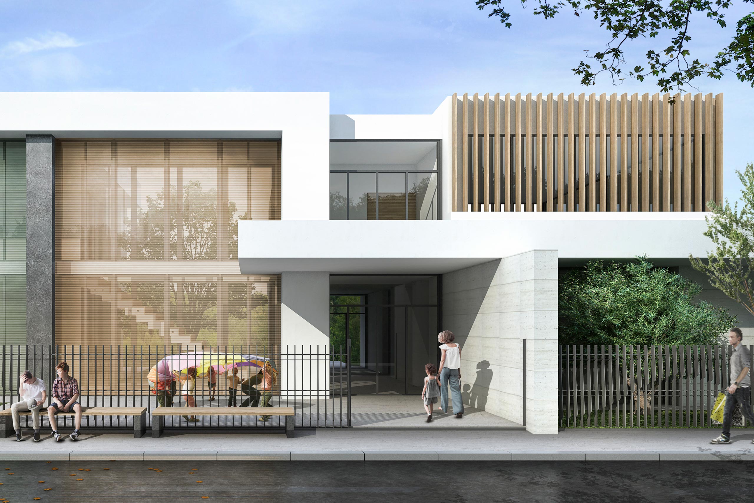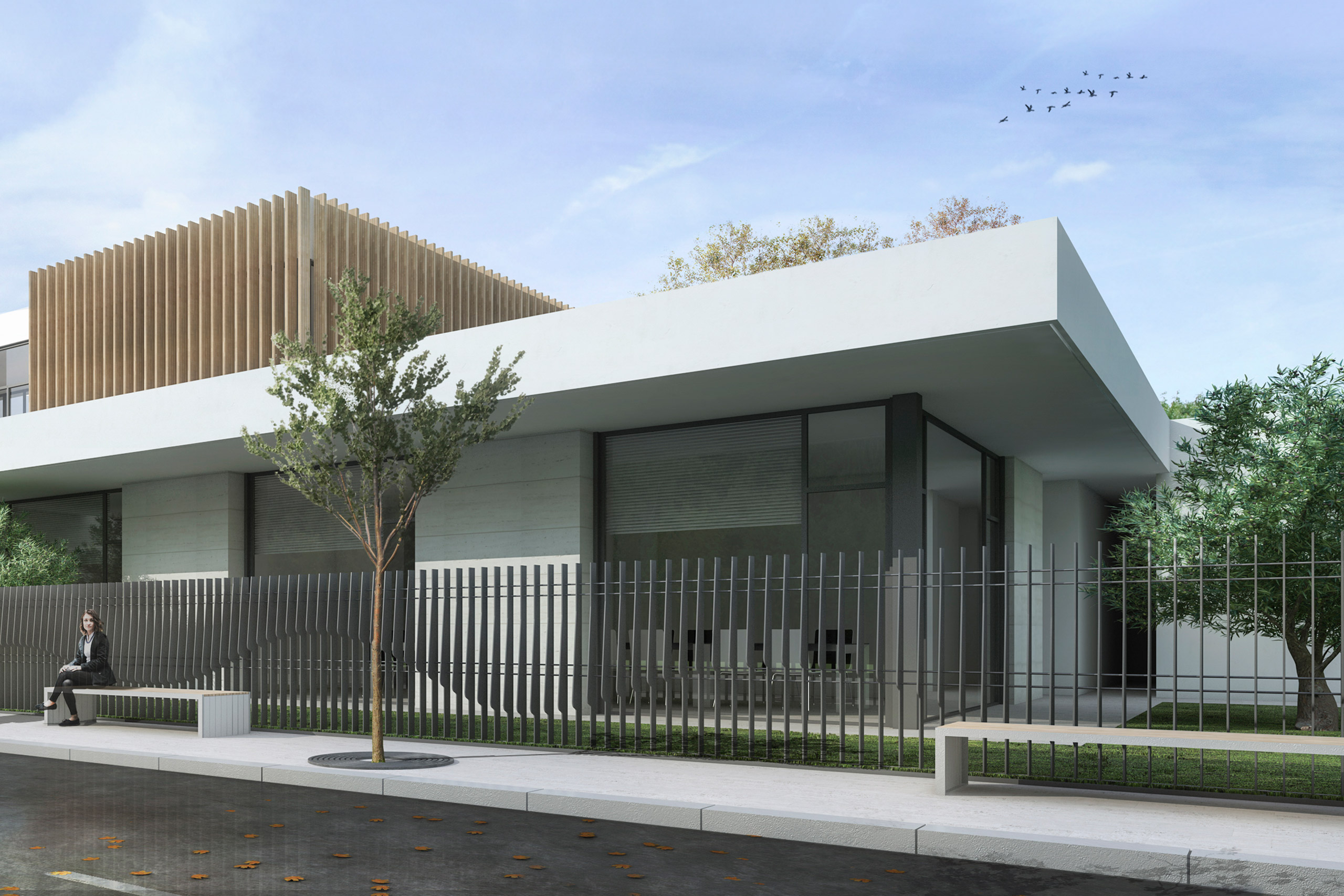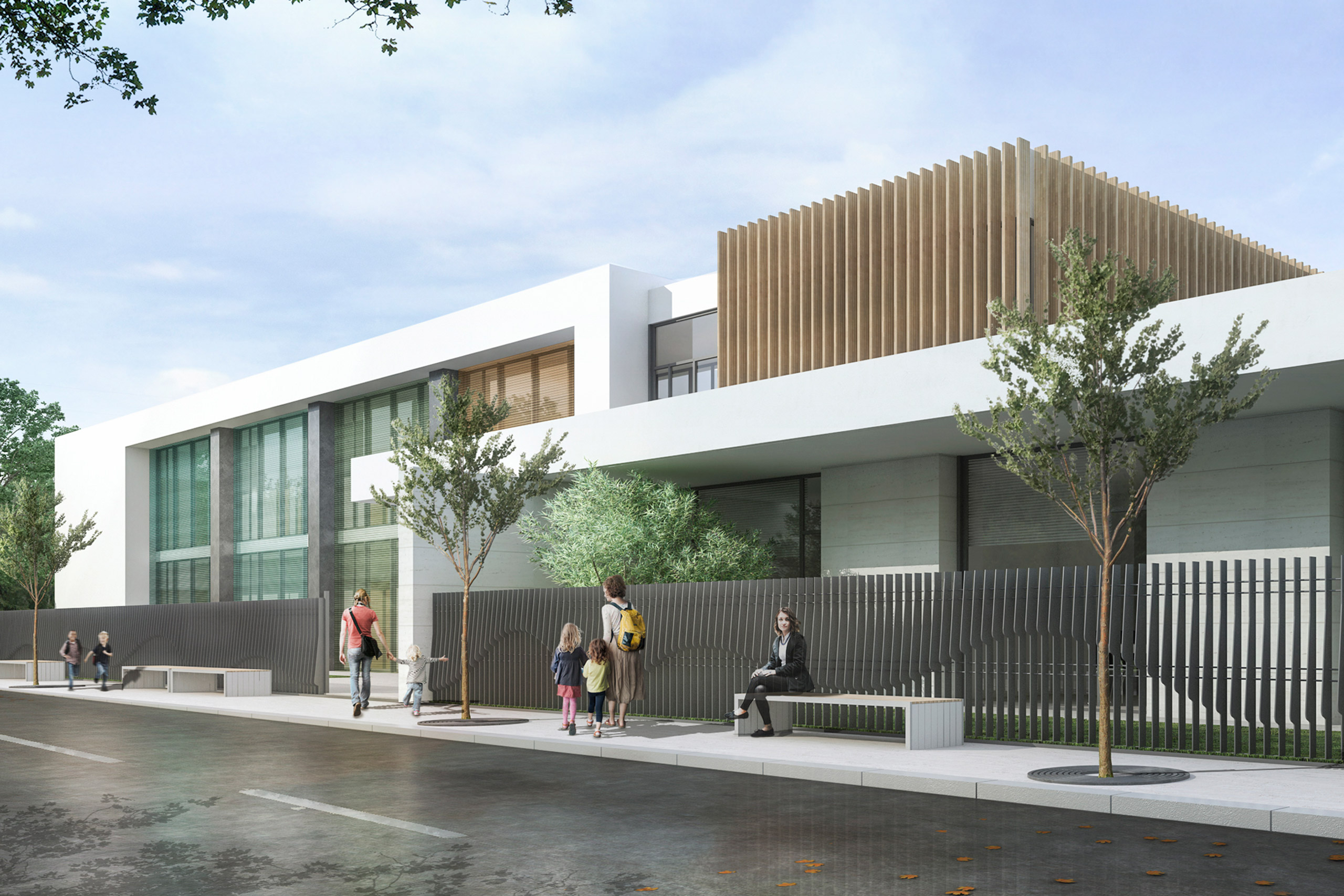 El juego de volúmenes de lamas de madera y chapas microperforadas y los planos blancos que se entrecruzan confieren la imagen dinámica del edificio que dialoga con el carácter urbano del entorno.