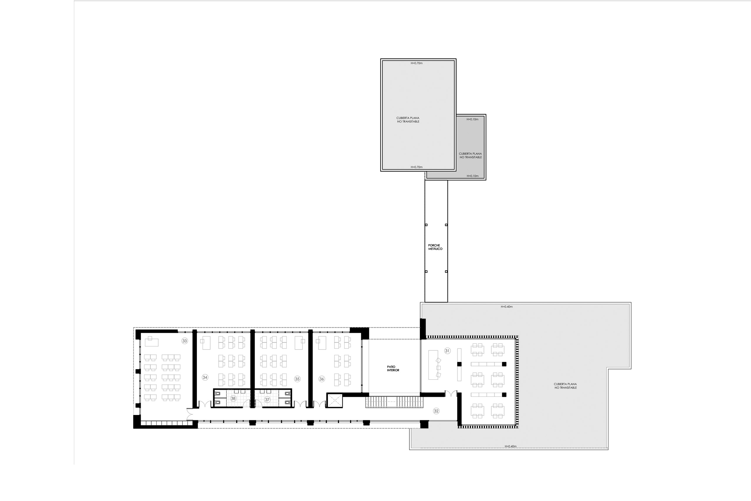 Este se resuelve articulando estas dos piezas mediante un patio central abierto. Tanto el acceso principal como el núcleo de comunicaciones se ubicarán envolviendo este patio, convirtiéndolo así en el centro neurálgico del edificio.
