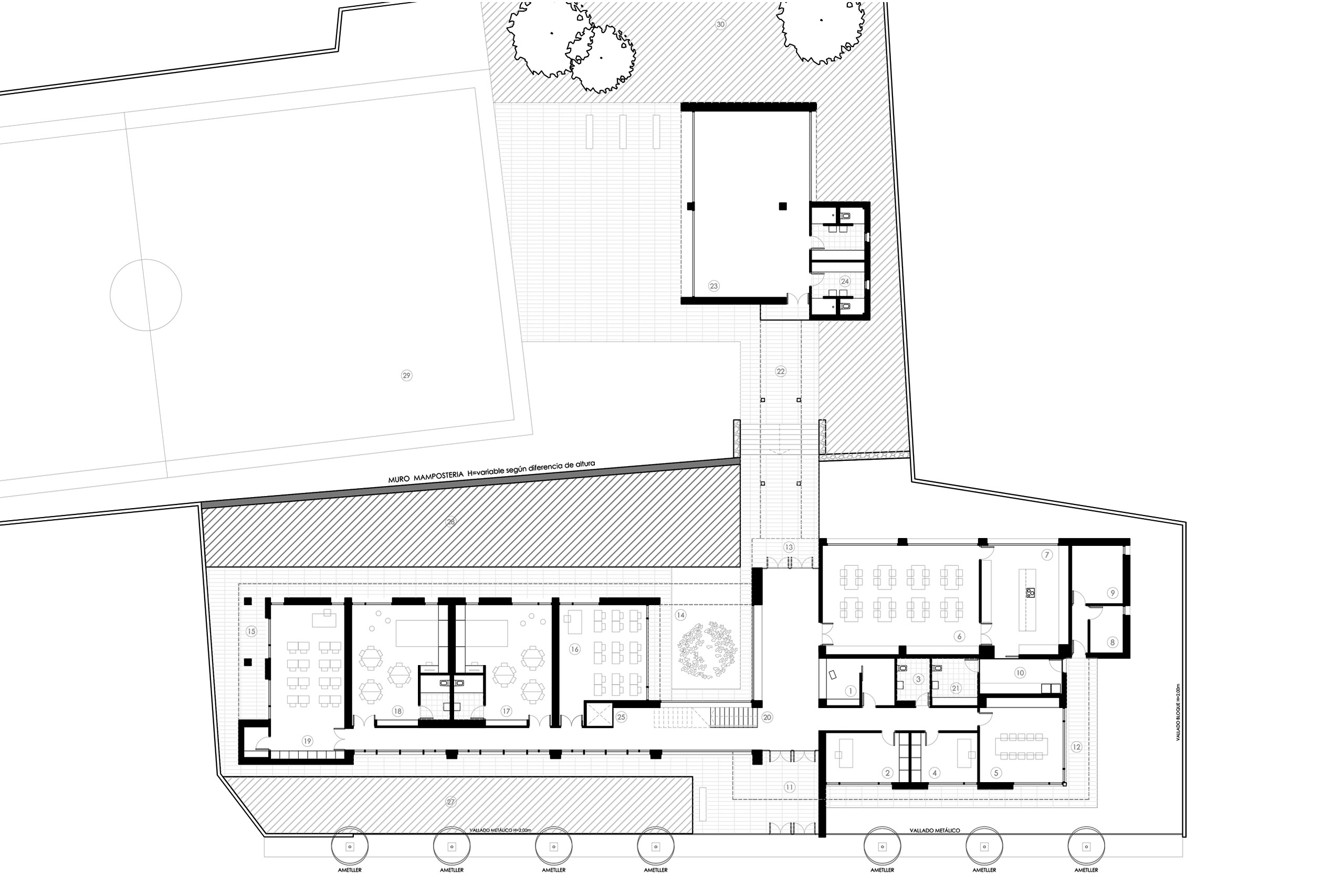 El concurso de ideas para un aulario de obra nueva requería un programa rigurosamente definido, en el que diferenciamos claramente dos bloques, un primer conjunto que abarcaría los usos de servicios comunes y un segundo que acogería al aulario.