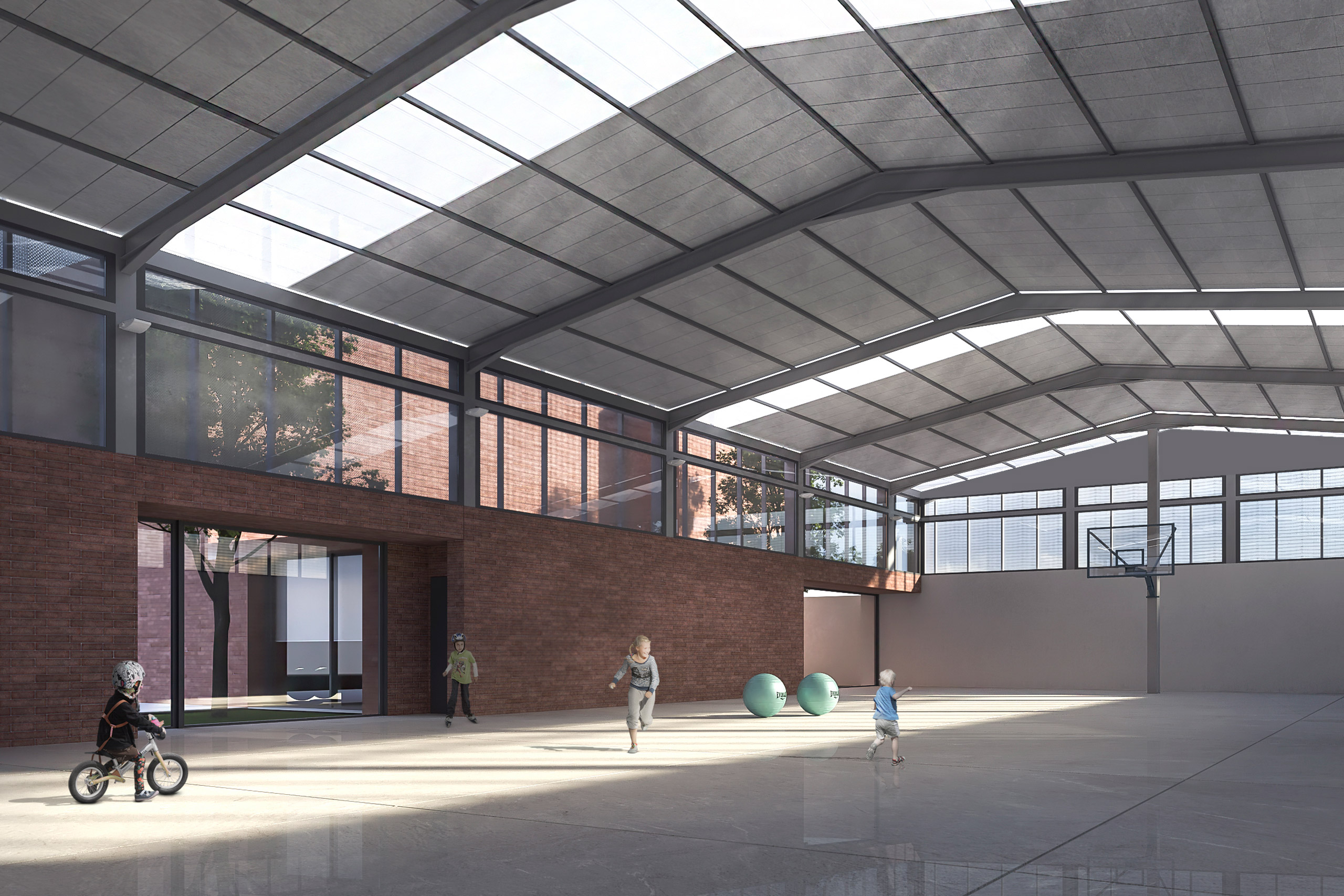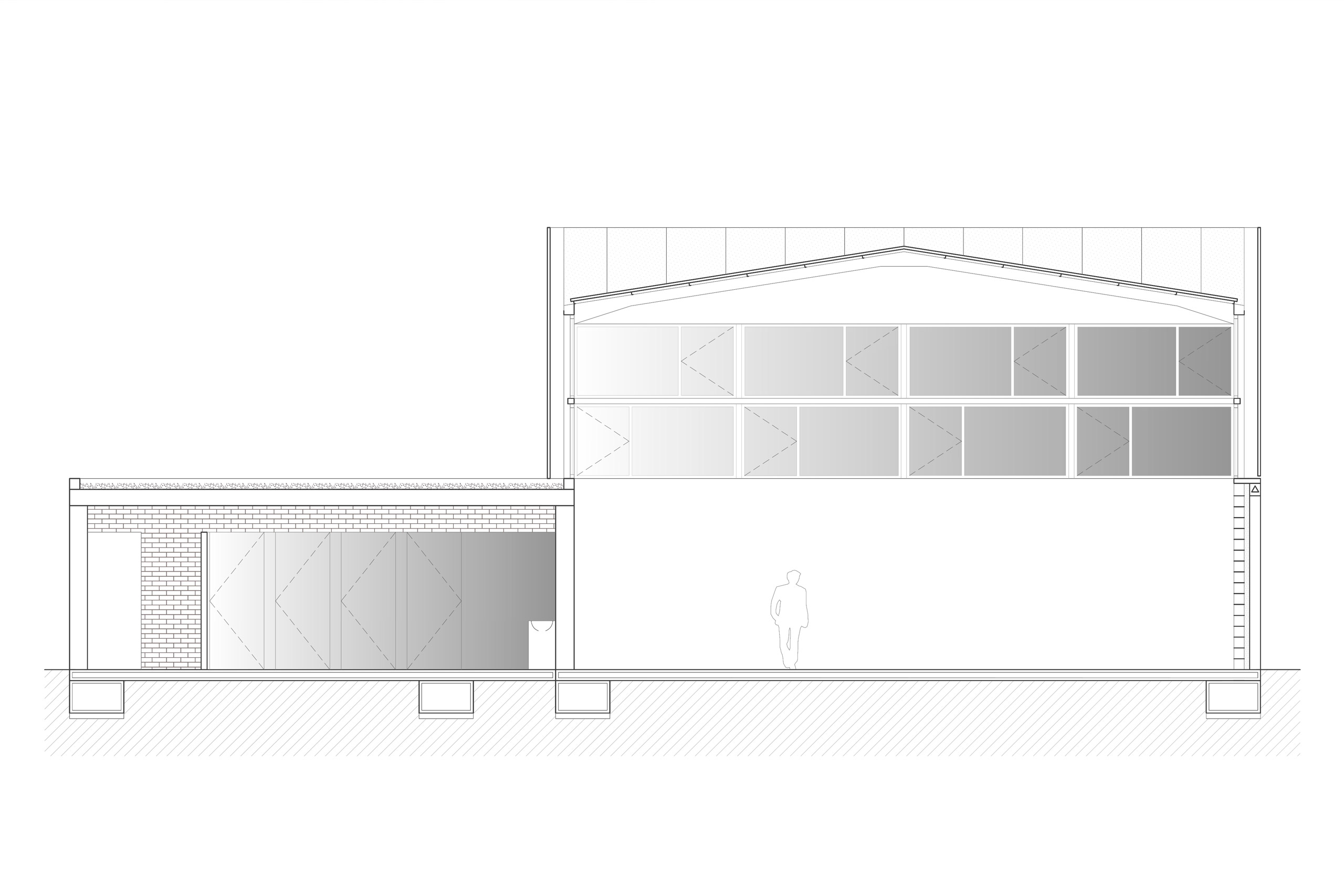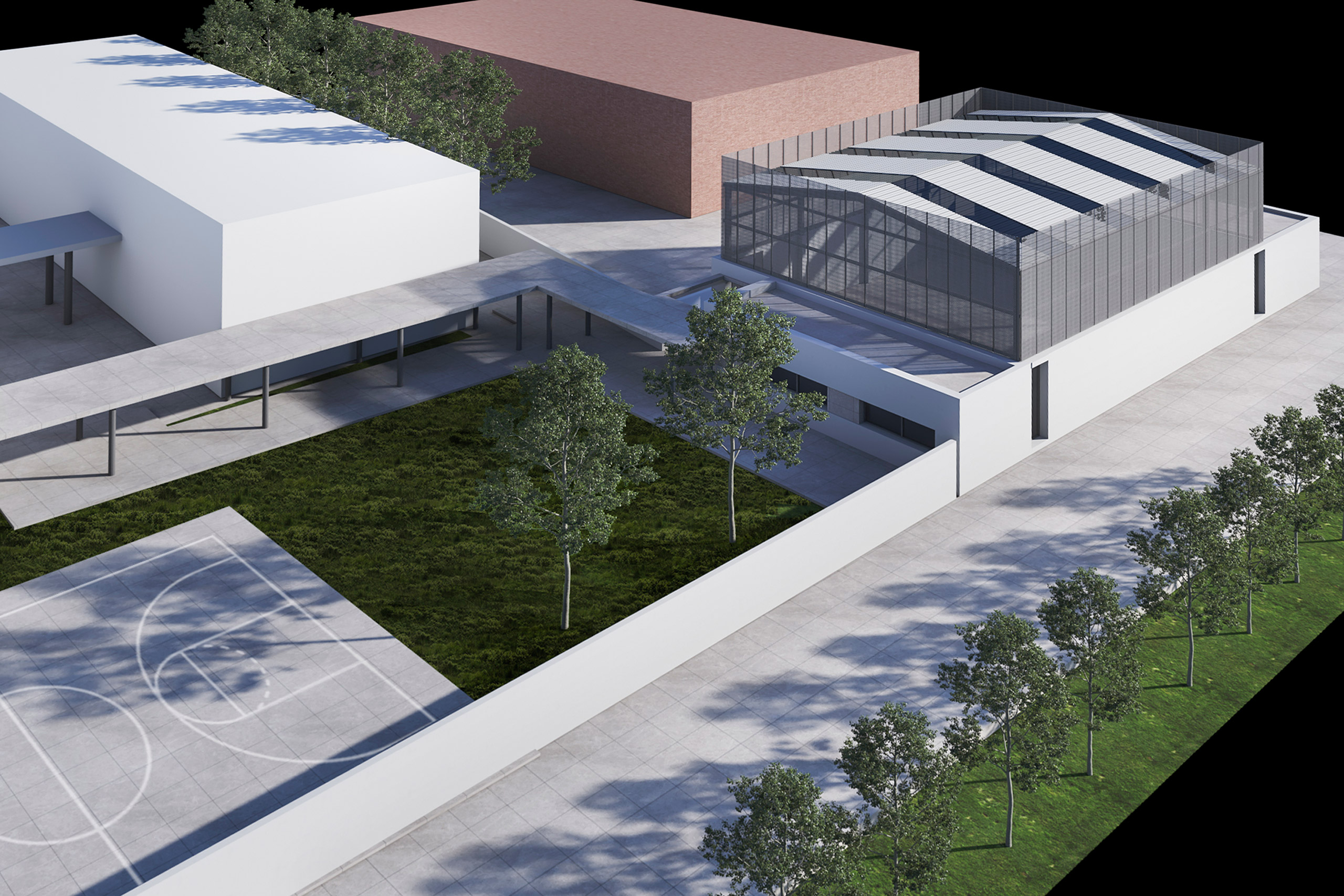 Se propone que desde la S.D. tengamos tres salidas directas al exterior y con un acceso amplio que permita la entrada de elementos de grandes dimensiones. La fachada oeste del gimnasio se resuelve con lana de roca y unas piezas cerámicas agujereadas para rebajar la reverberación de la S.D.
